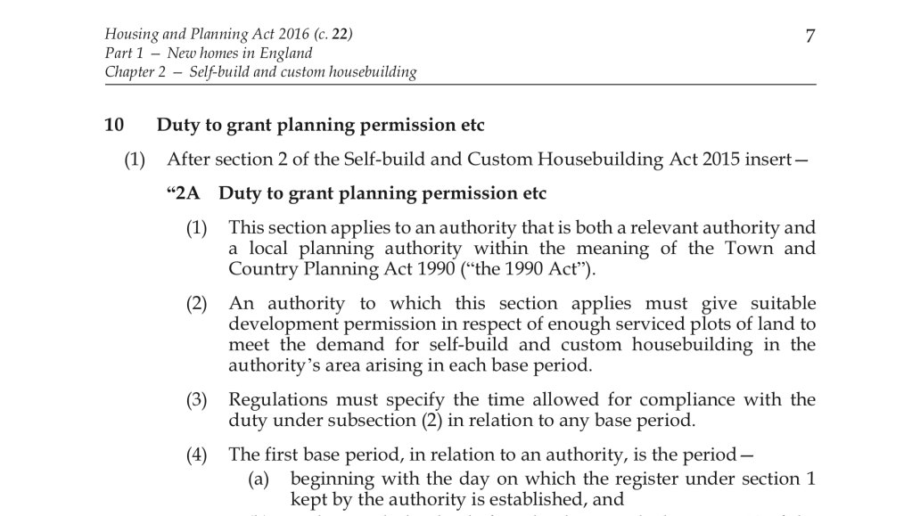 The government was trying to help ordinary families build homes in the boroughs they wanted to live in. Councils were required to launch Self Build Registers for people to express an interest, and the Housing and Planning Act 2016 required local authorities to ensure that they had granted ‘permission’ for enough sufficient shovel-ready plots to match the local demand on their register.